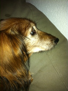 De hele dag, links voor achter, loopt ze me voor de voeten. Heel dicht bij me ( er zou haar eens een hapje ontgaan) ziet niet veel meer, ze is doof, maar kwispelt als ze me ziet, huppelt naar haar bakje.